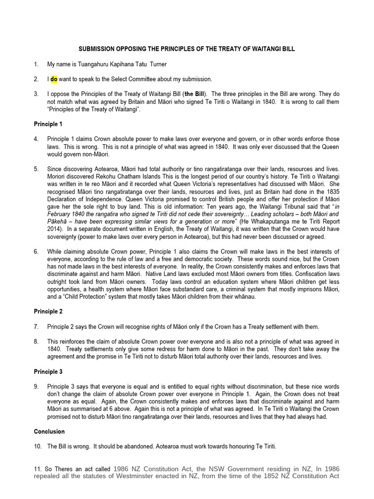 Submission Opposing the Principles of the Treaty of Waitangi Bill