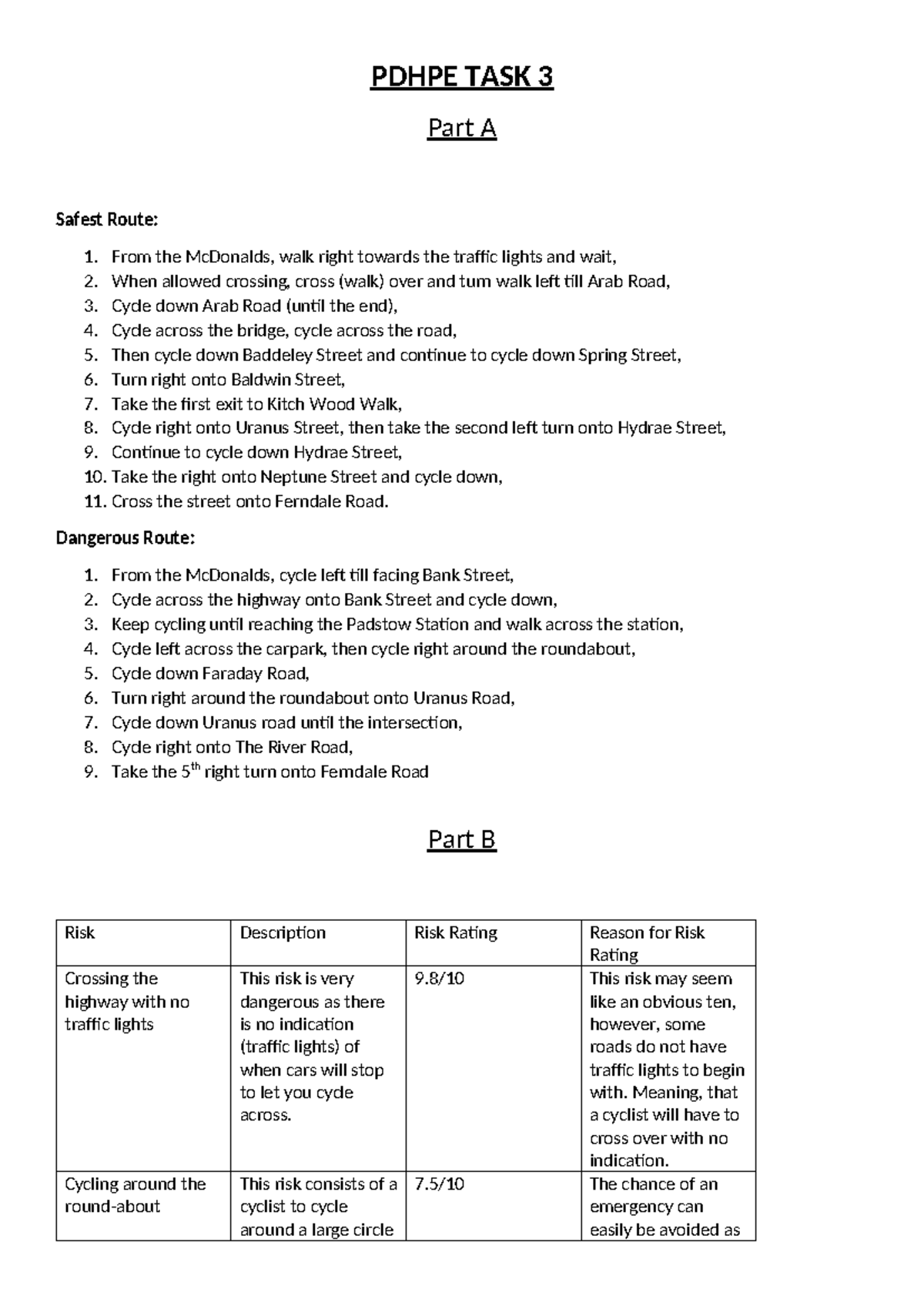 Pdhpe TASK 3 - ppppppppp - PDHPE TASK 3 Part A Safest Route: 1. From ...