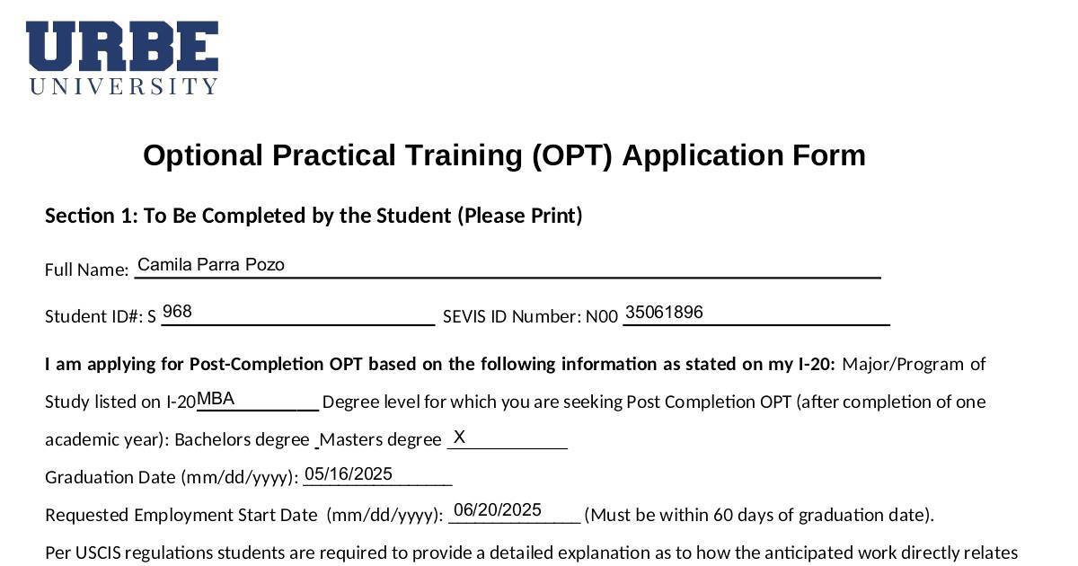 Fillable Online Optional Practical Training (OPT) for F-1 ...