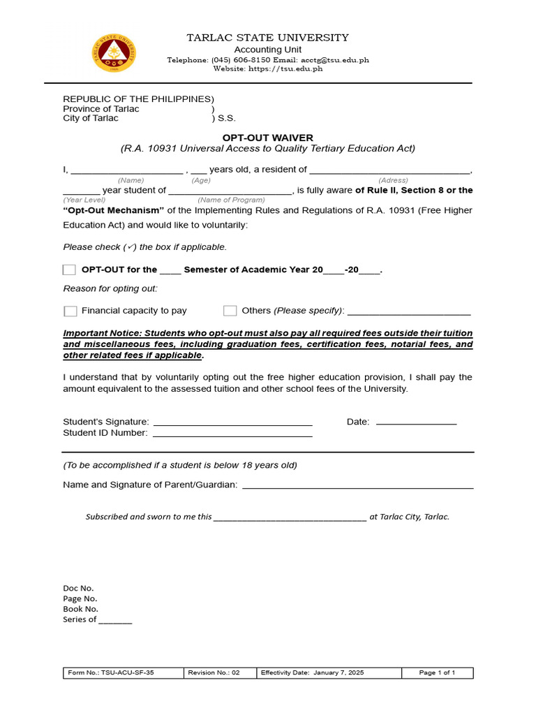 Opt-Out Waiver and Voluntary Contribution Form With Guidelines | PDF ...