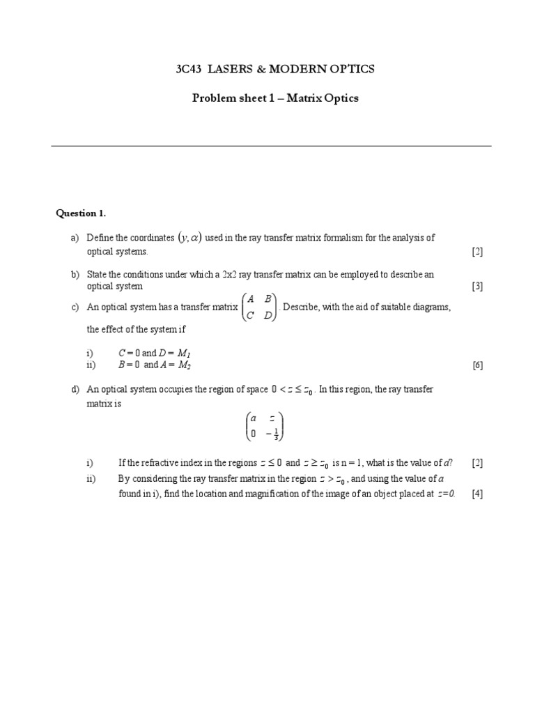 3C43 Lasers & Modern Optics Problem Sheet 1 - Matrix Optics | PDF