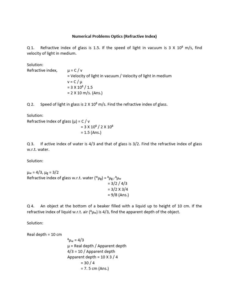 Numerical Problems Optics | PDF | Refraction | Refractive Index
