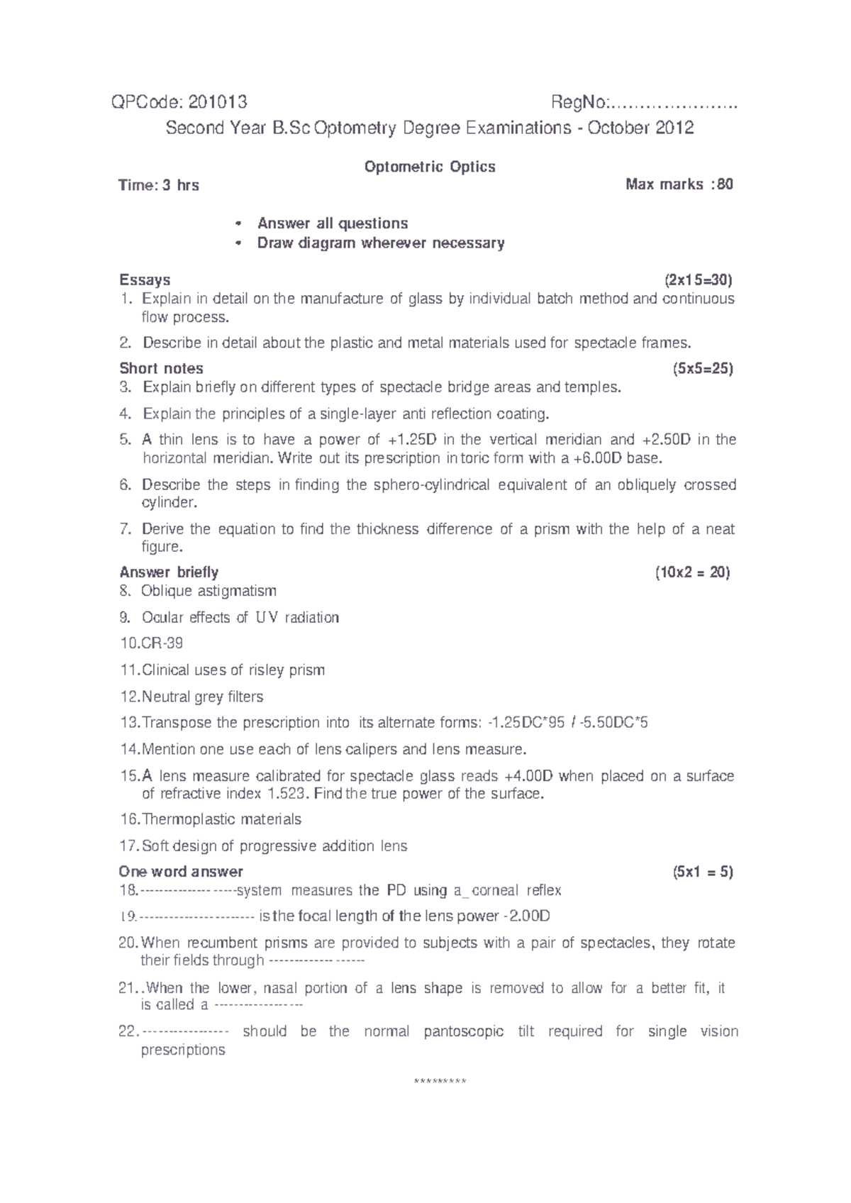 BSc Optometry 2nd Yr Exam QP Oct 2012: Optometric Optics - Studocu