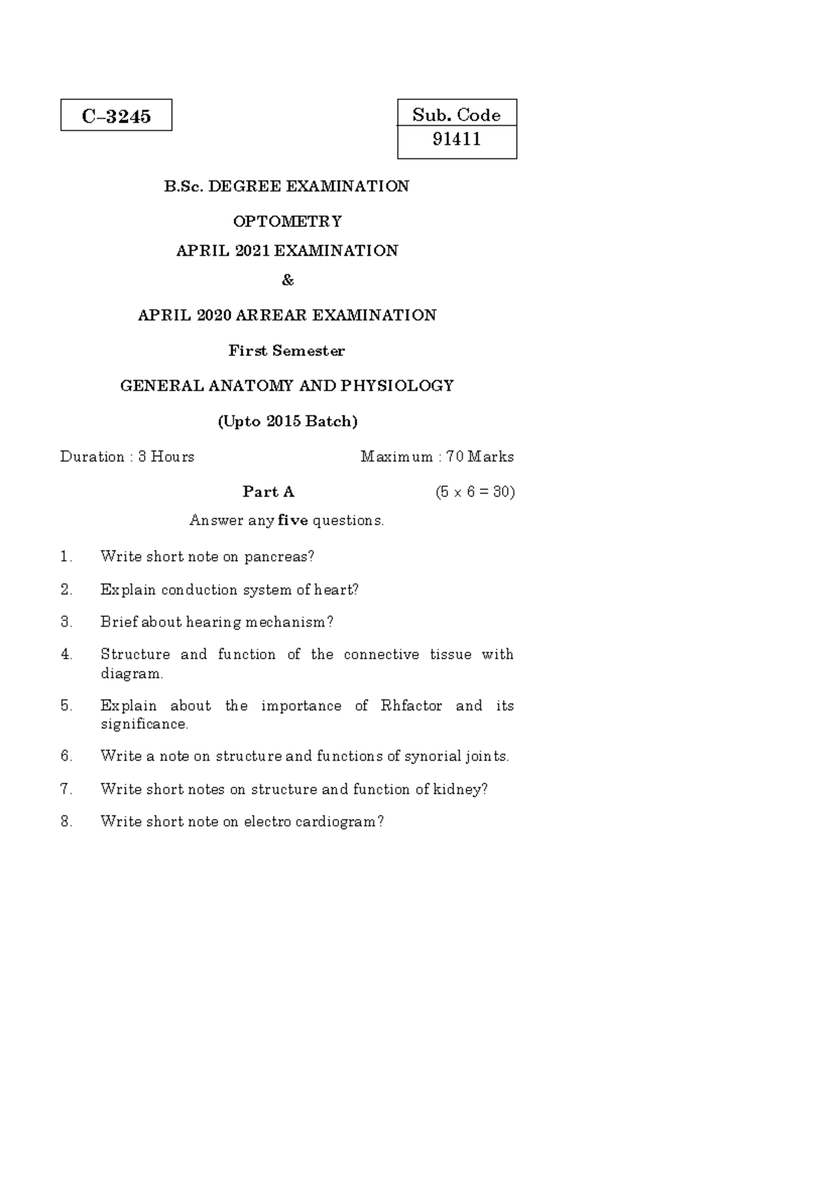 Sub. Code 91411 B.Sc. Optometry Final Exam April 2021 - Anatomy ...