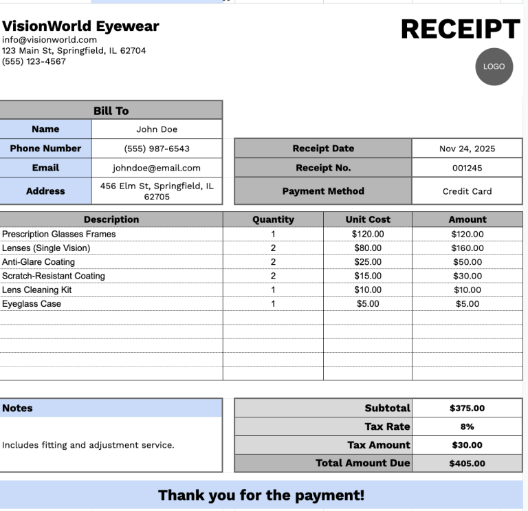 Free☝️ Eyeglasses Receipt Template (Google Sheets, Excel, Word, Google ...
