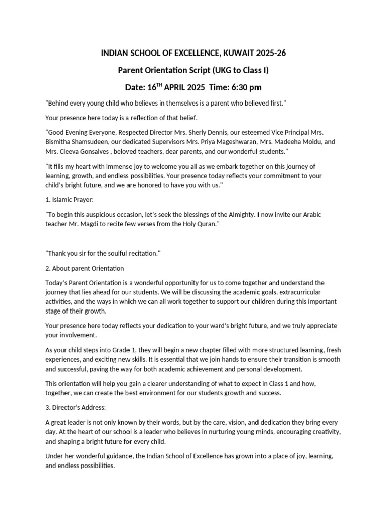 Parent's Orientation Script | PDF