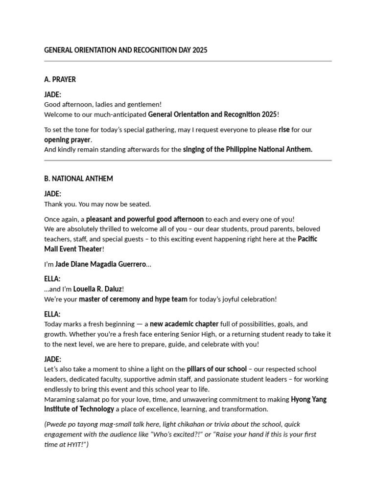 EMCEE SCRIPT FOR THE COLLEGE ORIENTATION PROGRAM | PDF