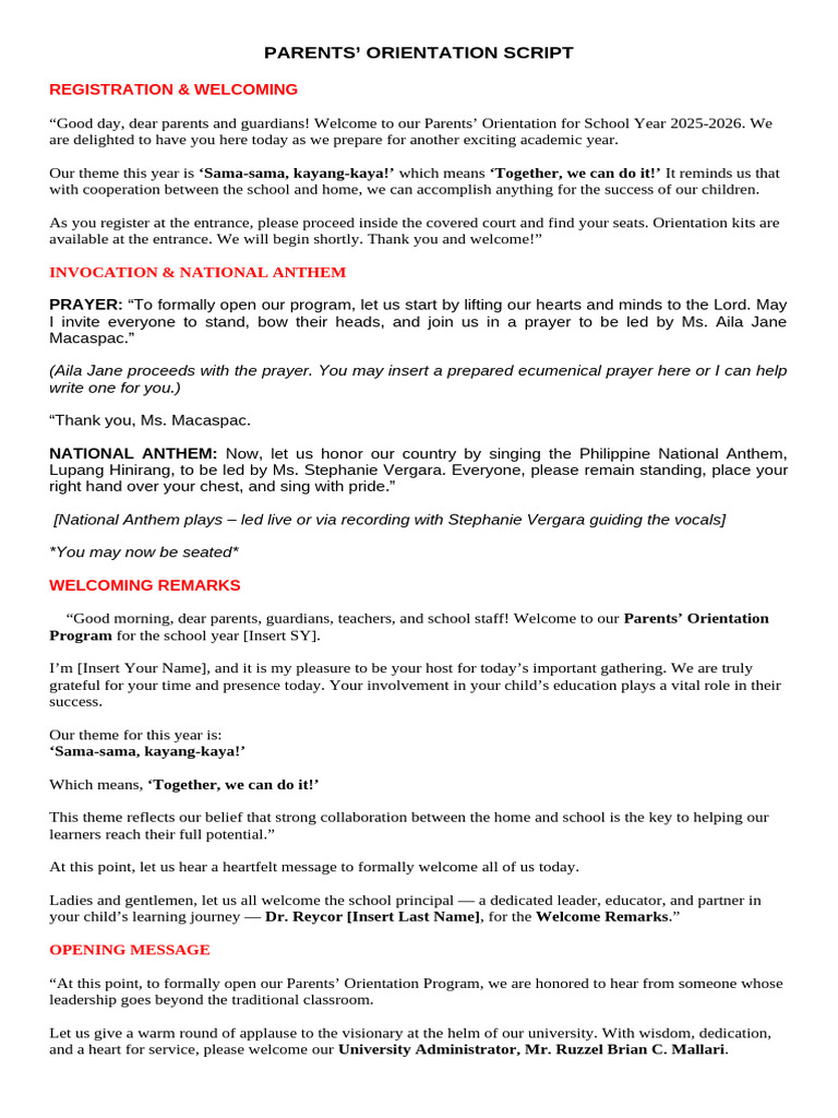 Parents' Orientation Script - PARENT’S ORIENTATION EMCEE SCRIPT ...