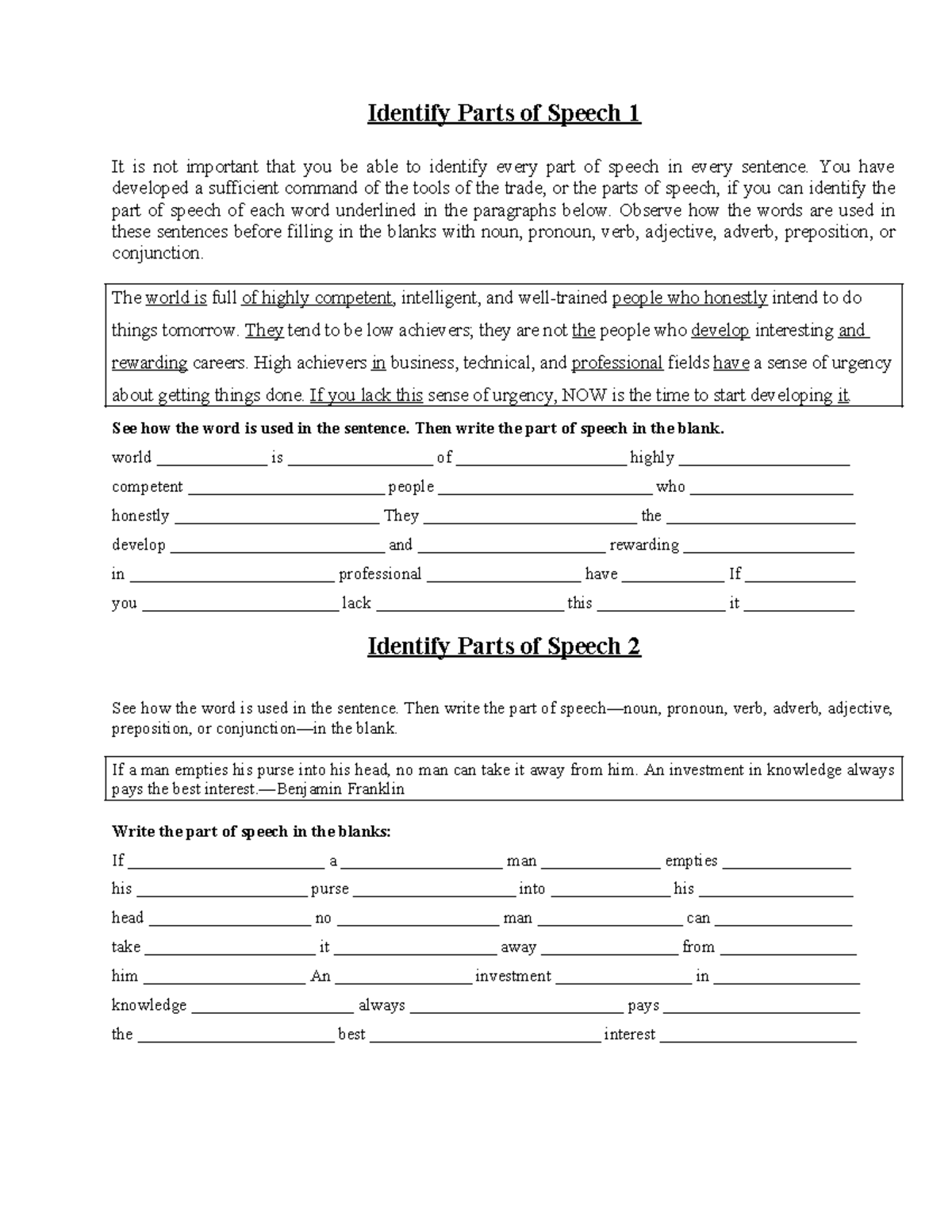Identify Parts of Speech 1 & 2: Exercises and Examples - Studocu