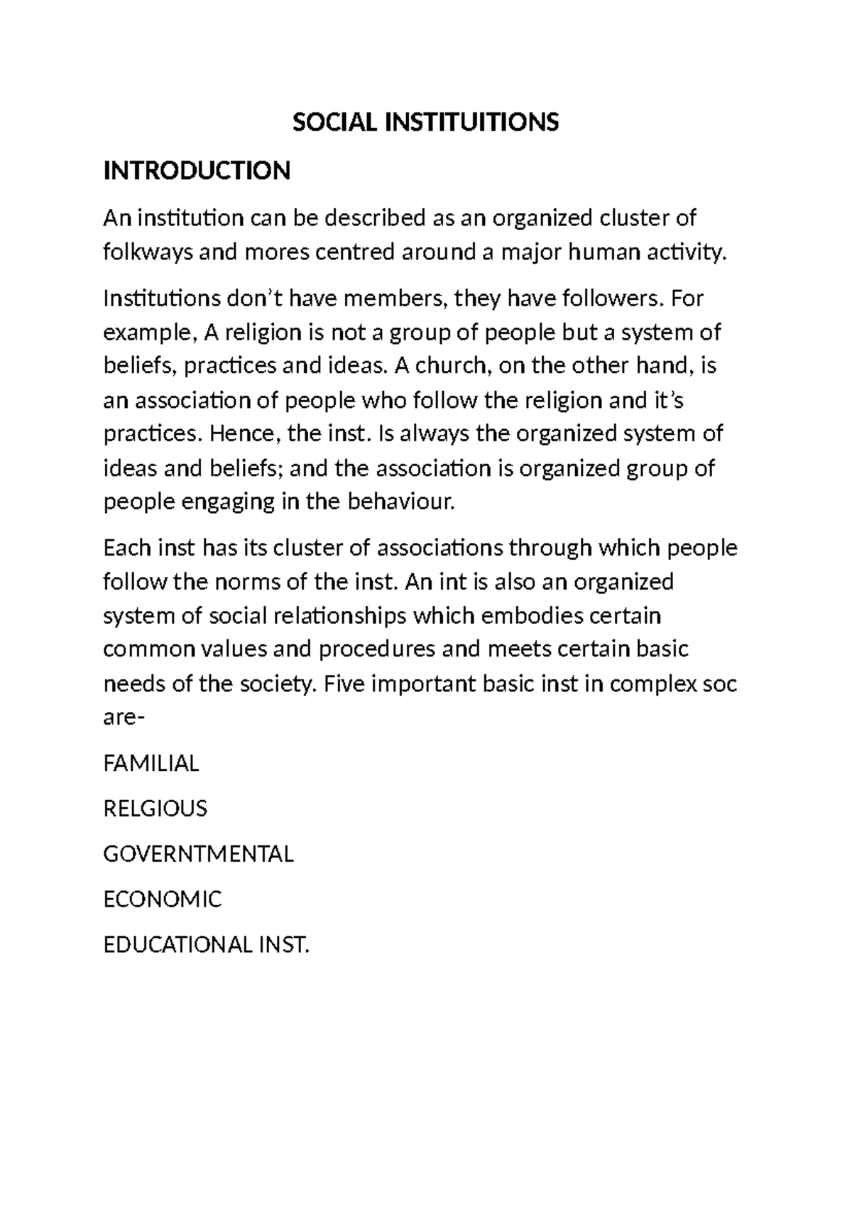 SOCIAL INSTITUTIONS INTRODUCTION: Key Concepts and Examples - Studocu