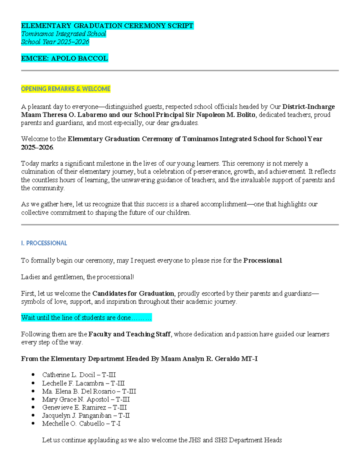 Corrected Script for Elementary Graduation Ceremony 2026 - Studocu
