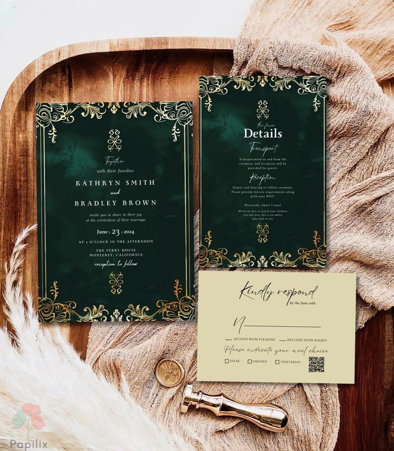Emerald Green Wedding Invitation Template Set, Gold Foil Look Invite ...
