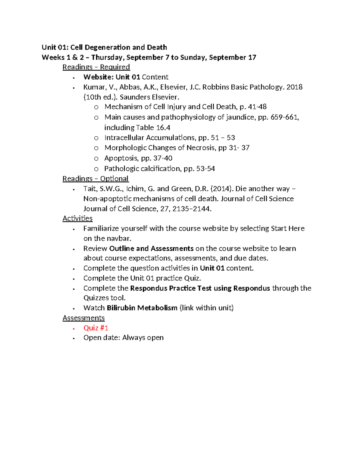 Course Outline Principles of Disease - Unit 01: Cell Degeneration and ...