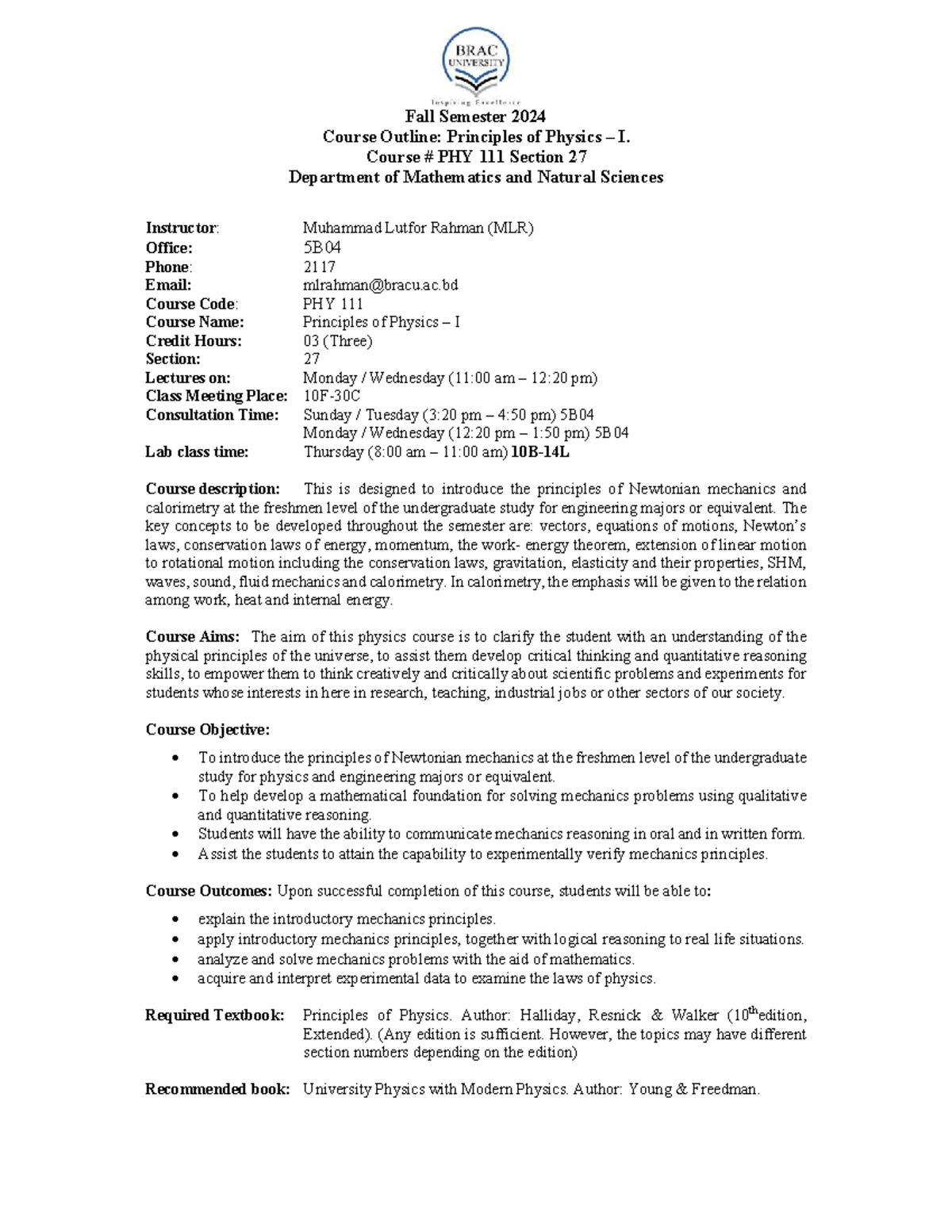 PHY111 Fall 2024 Course Outline: Principles of Physics I - Studocu