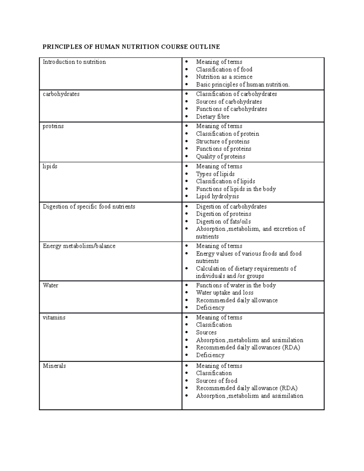 Course Outline: Principles of Human Nutrition (HNU 101) - Studocu