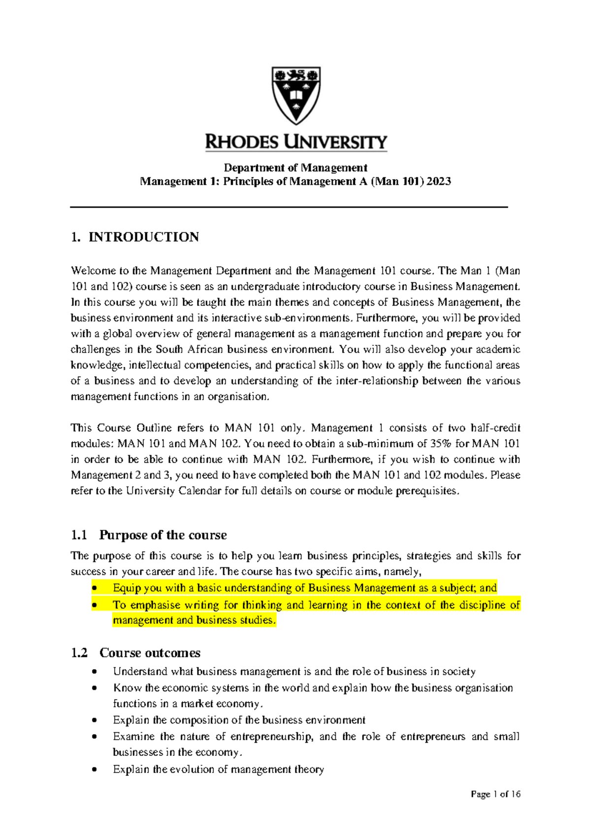 Management 101 Course Outline - Principles of Management A 2023 - Studocu