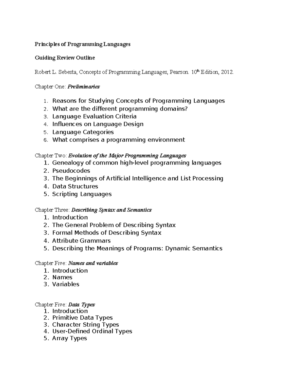 Principles of Programming Languages Guiding Outline - Principles of ...