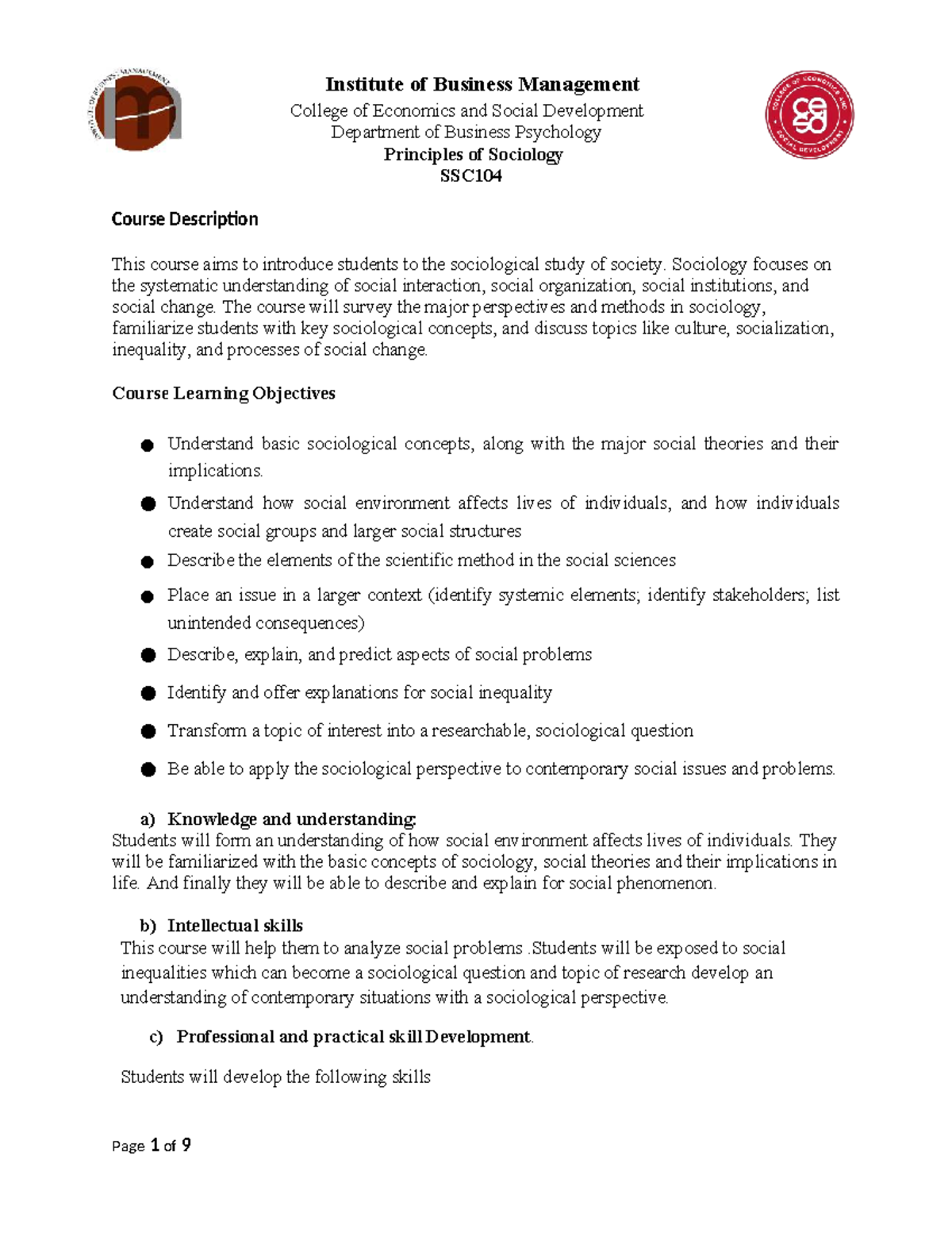 Course Outline Principles of Sociology - Institute of Business ...