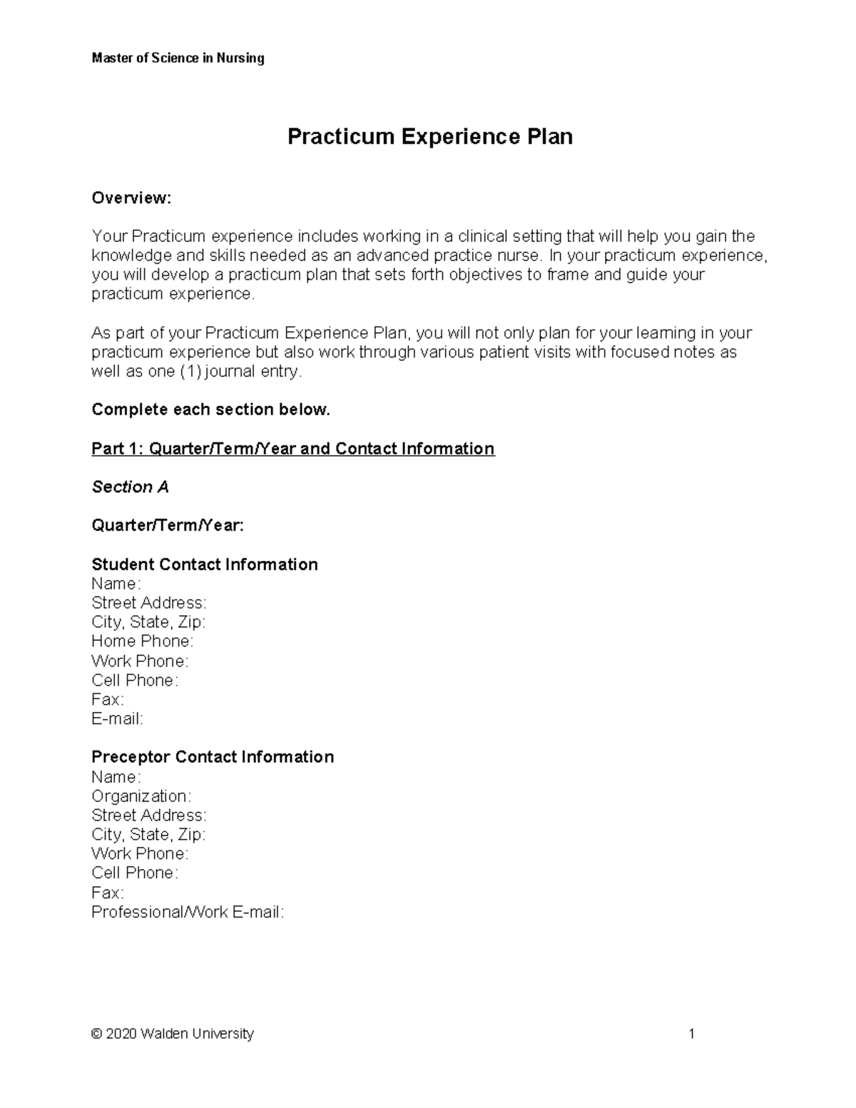 MSN 2020 Practicum Experience Plan Overview and Objectives - Studocu