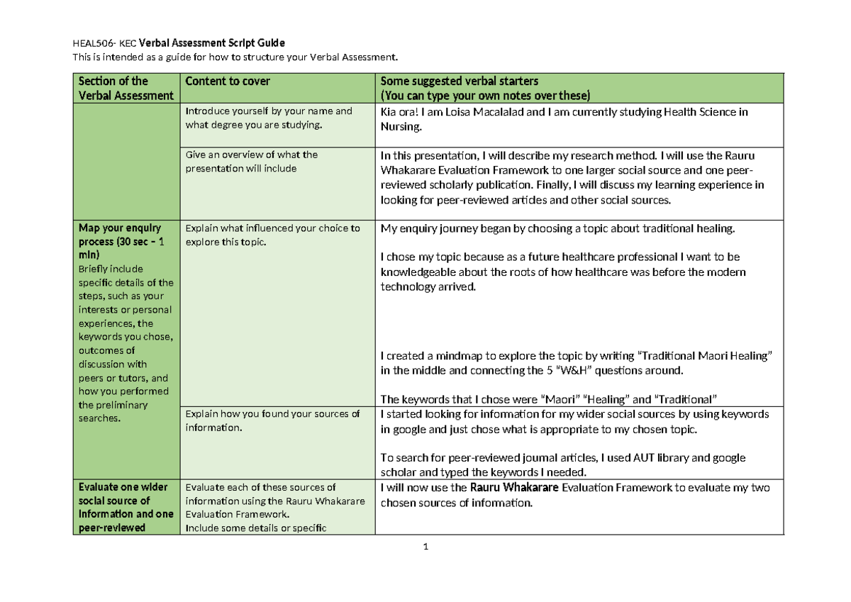 HEAL506 - KEC Verbal Assessment Structure Guide - Studocu