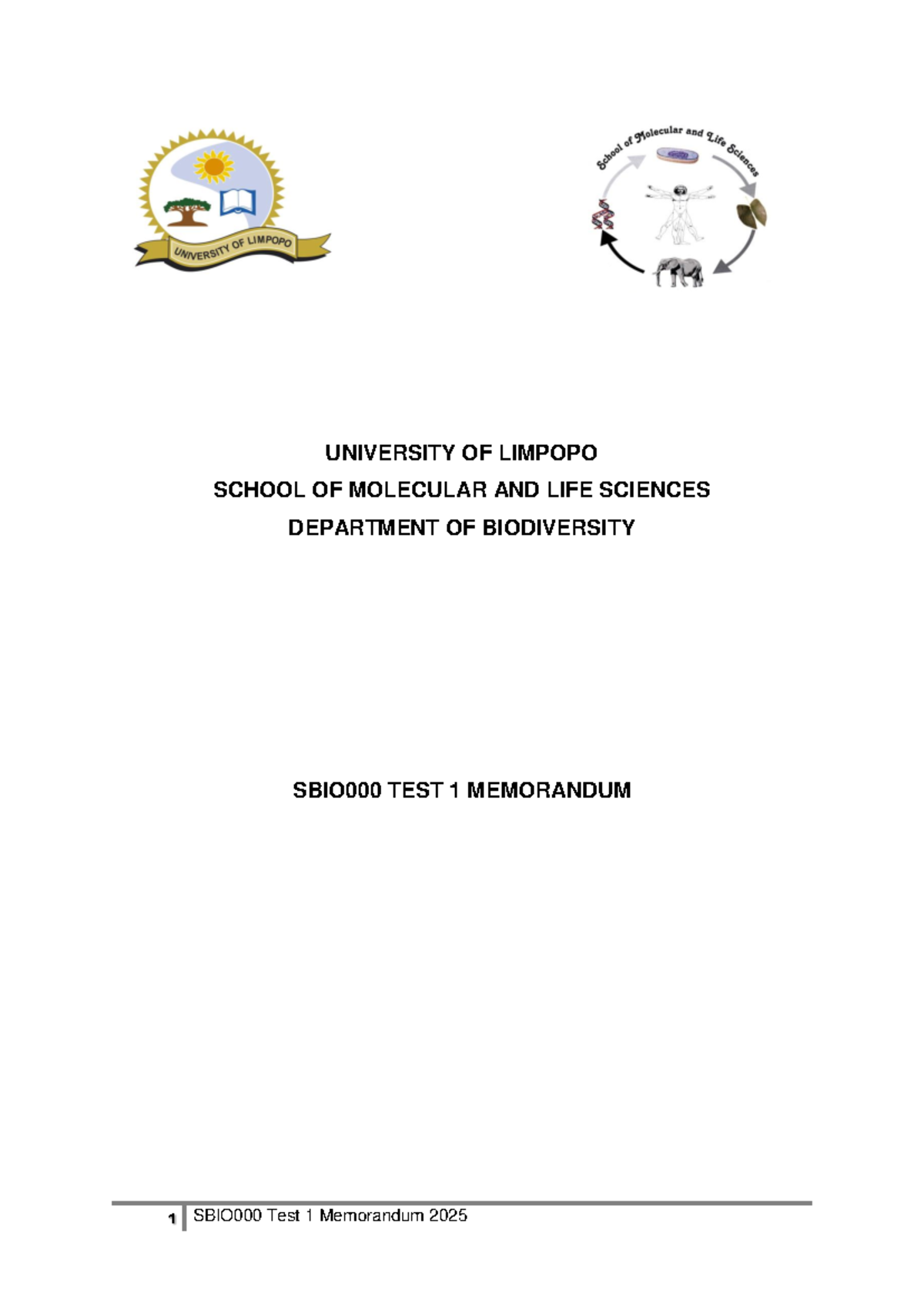 SBIO000 TEST 1 MEMO 2025 - Biodiversity Exam Answers - Studocu