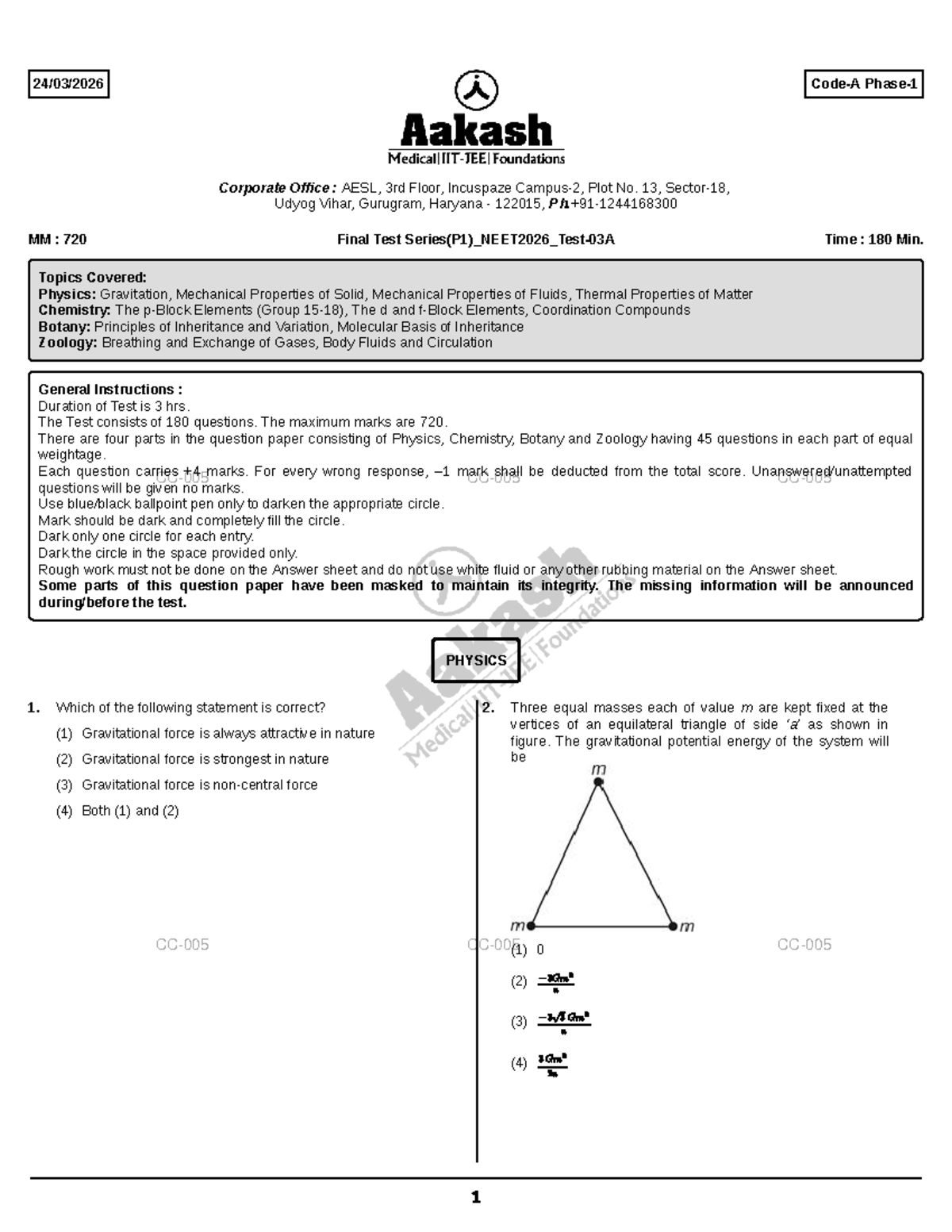 Final Test Series (P1) NEET 2026: Test 03A - Comprehensive Review - Studocu