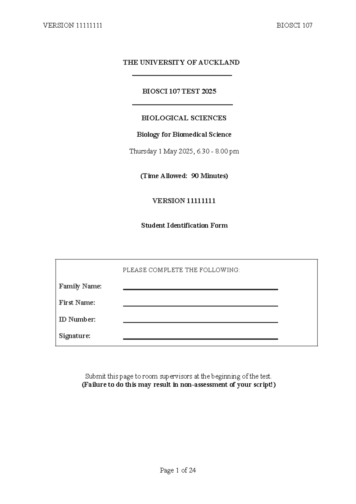 Biosci 107 2025 Test Version 1: Biological Sciences Exam Guide - Studocu