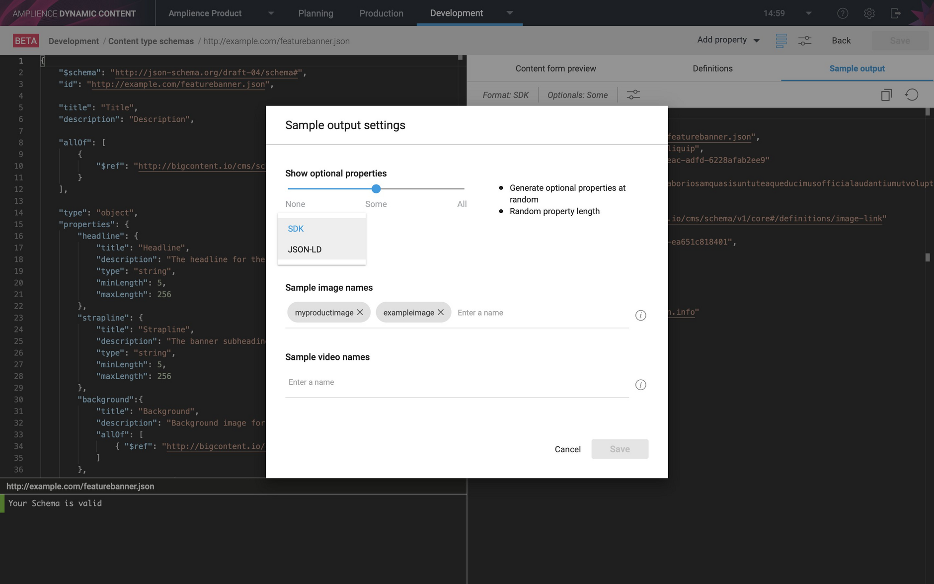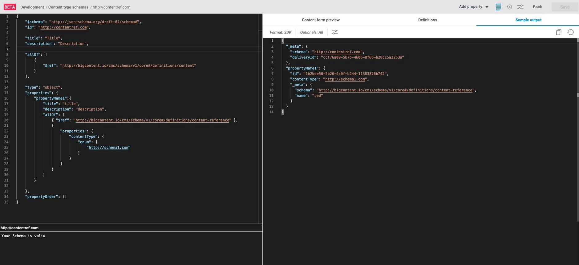 Dynamic Content Schema editor- example JSON output, Content references ...