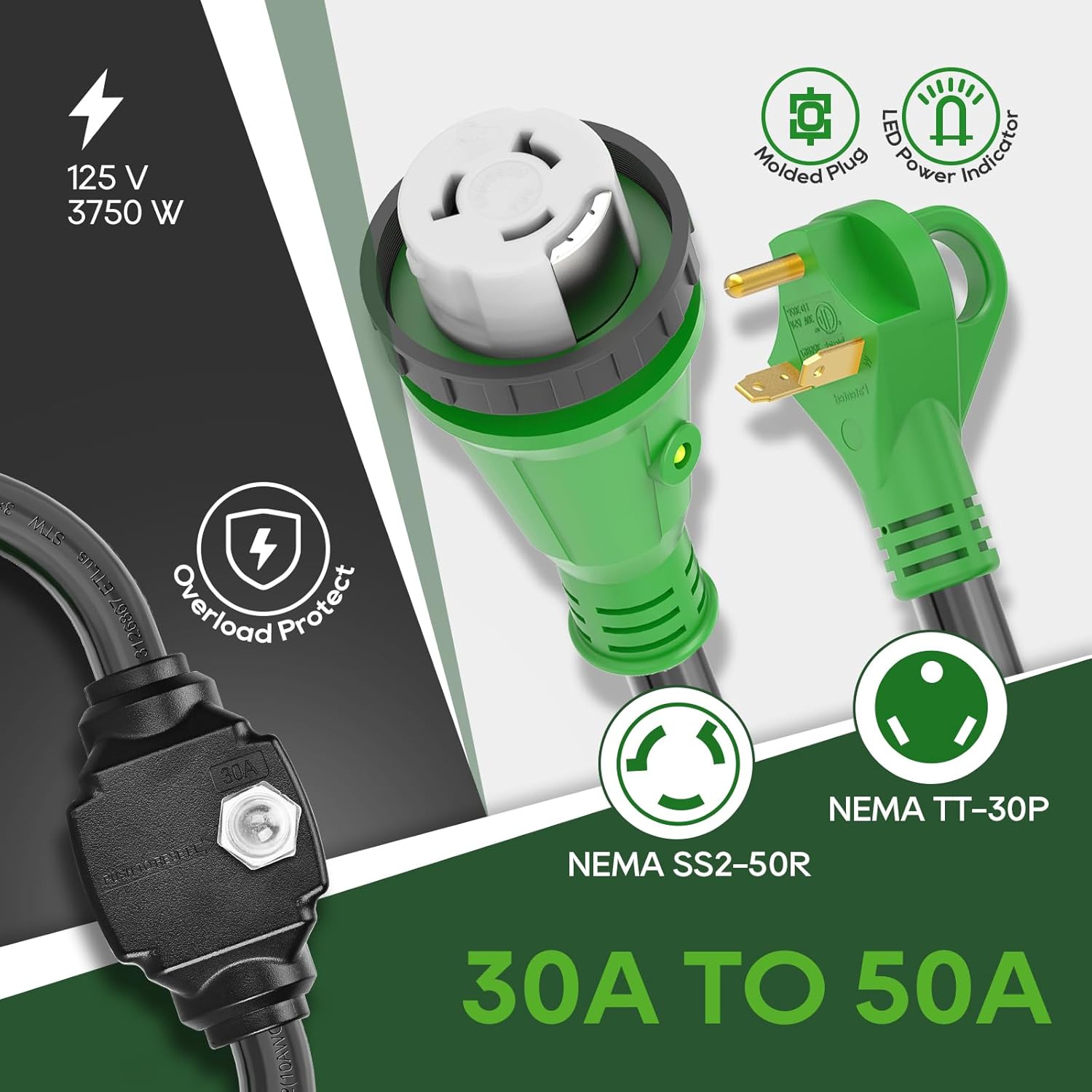 RVGUARD RV Adapter Cord with Overload Protector | 30 Amp to 50 Amp ...