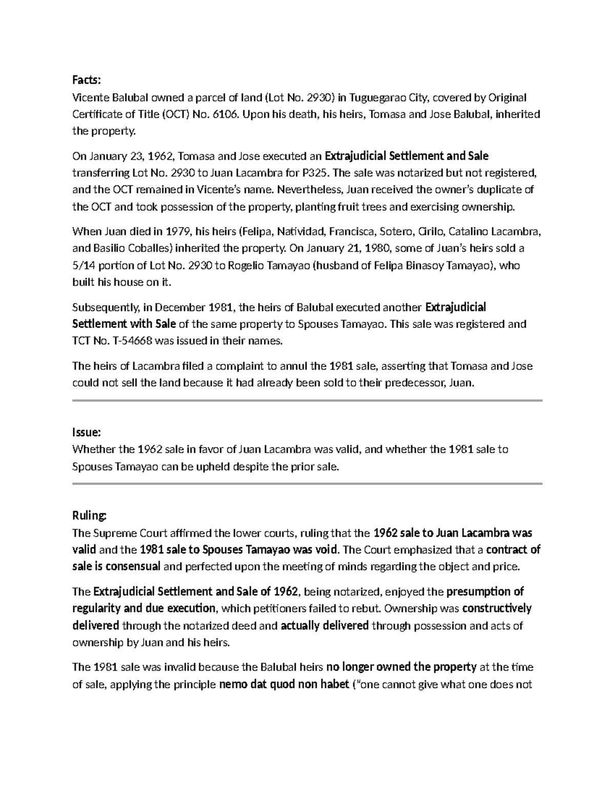 Tamayao vs. Lacambra: Validity of Land Sales and Ownership Issues - Studocu
