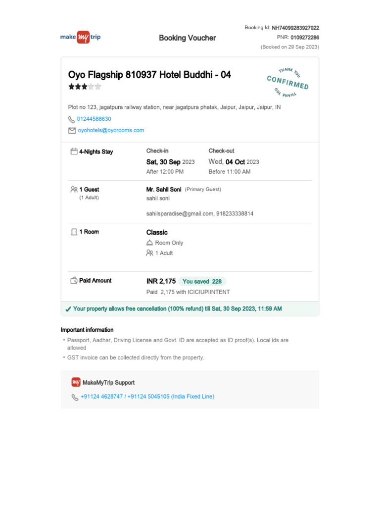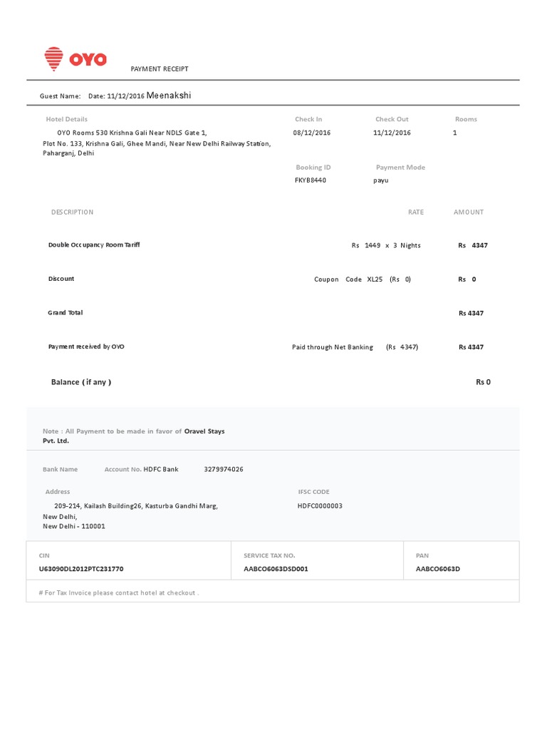 Detailed Payment Receipt for a Three Night Stay at an OYO Hotel in New ...