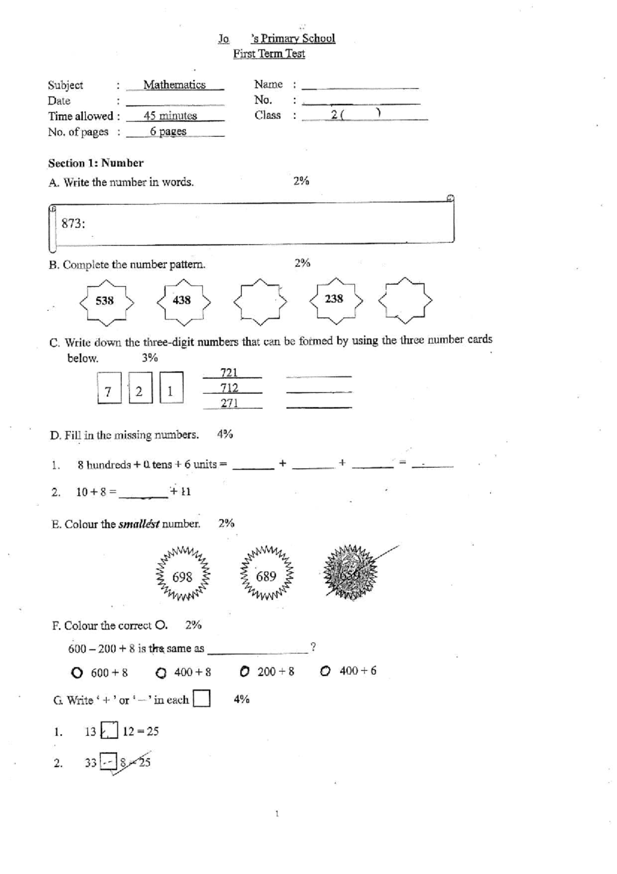 P2 Mathematics First Term Test Paper - Jo Primary School - Studocu
