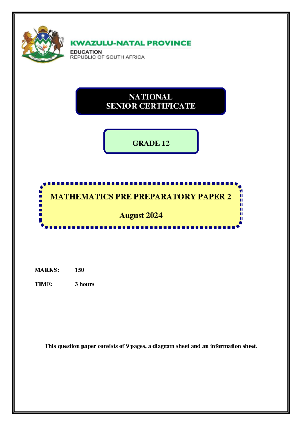 KZN Gr. 12 Maths P2 Aug 2024 - Practice Question Paper - Studocu