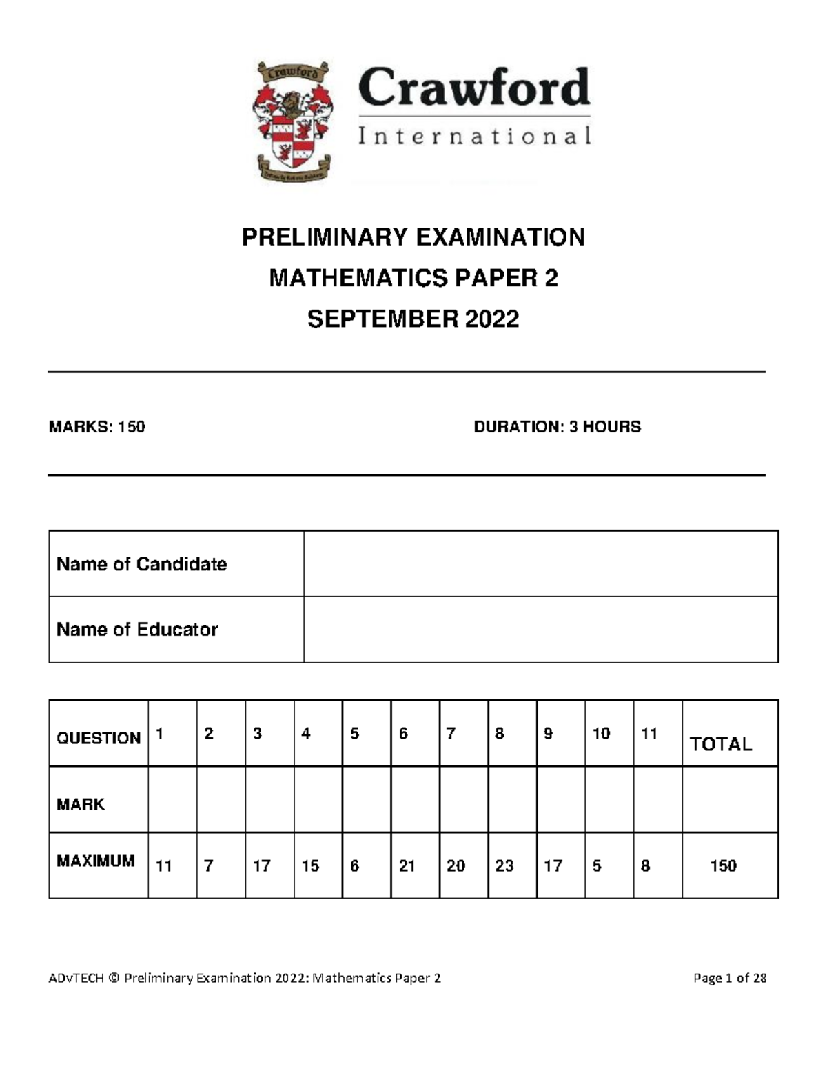 2022 Mathematics P2 Preliminary Exam Questions and Instructions - Studocu