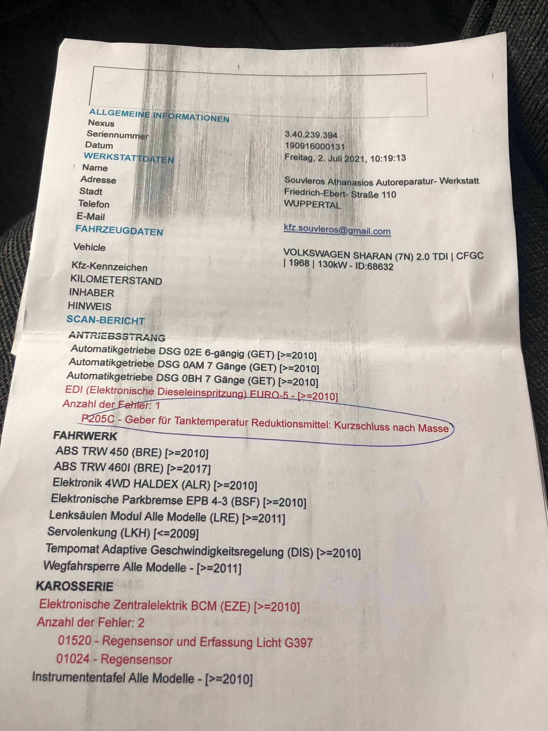 Fehlerlampe leuchtet, P205C00 Geber für Tanktemperatur Reduktionsmittel ...