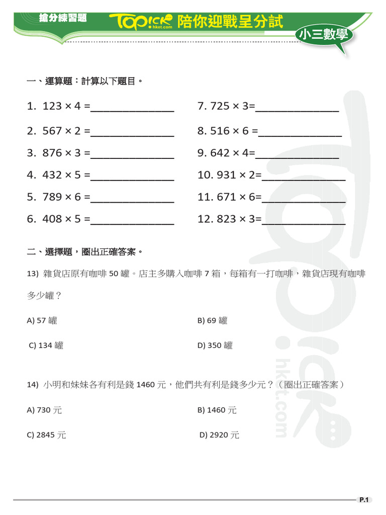P3 Mathematics First Term Test 2022-2023: Calculation Questions ...