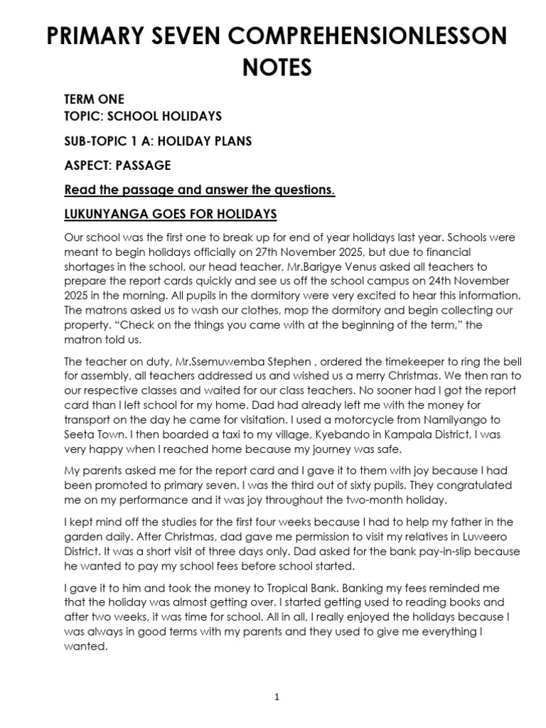 P7 Holiday Lesson Notes and Activities | PDF