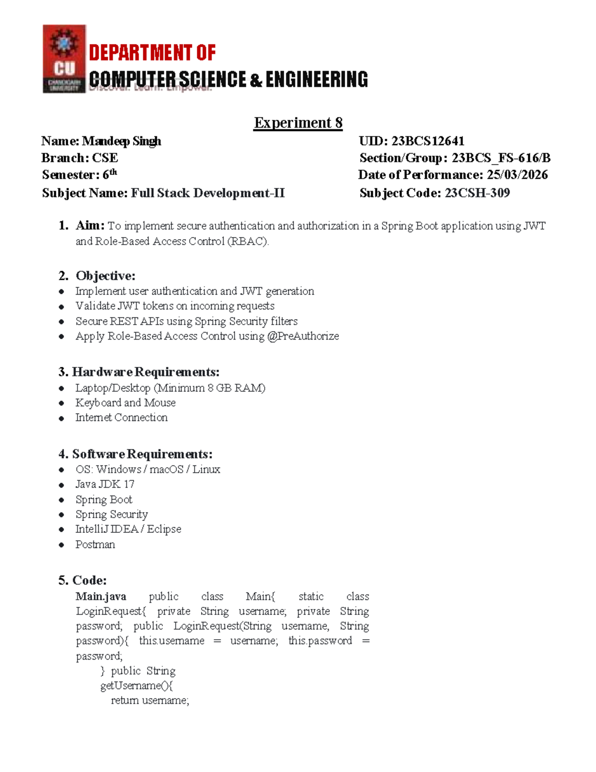 CSE 6th Sem Full Stack Exp 8: Secure Auth & JWT Implementation - Studocu