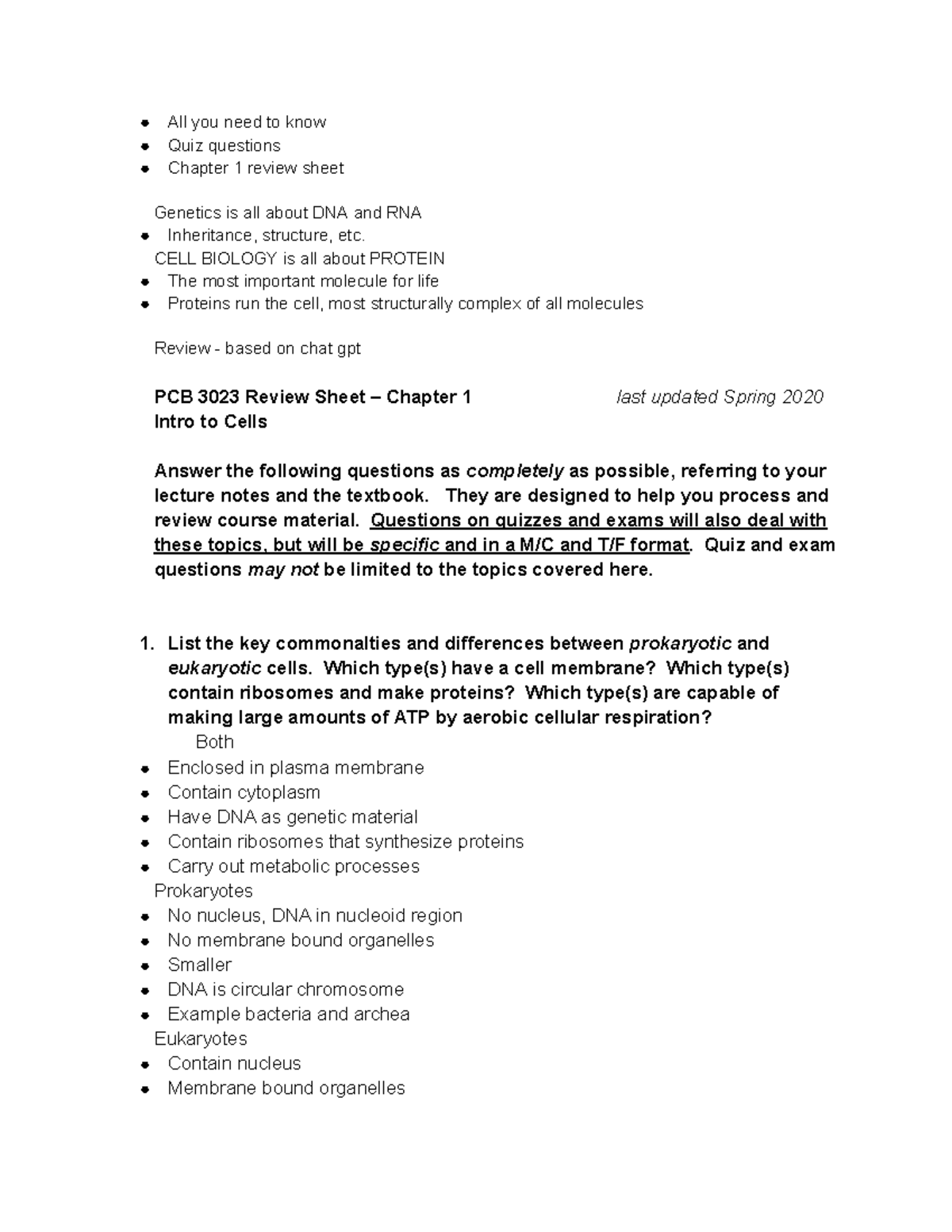 PCB 3023 Chapter 1 Cell Biology Study Guide & Quiz Review - Studocu