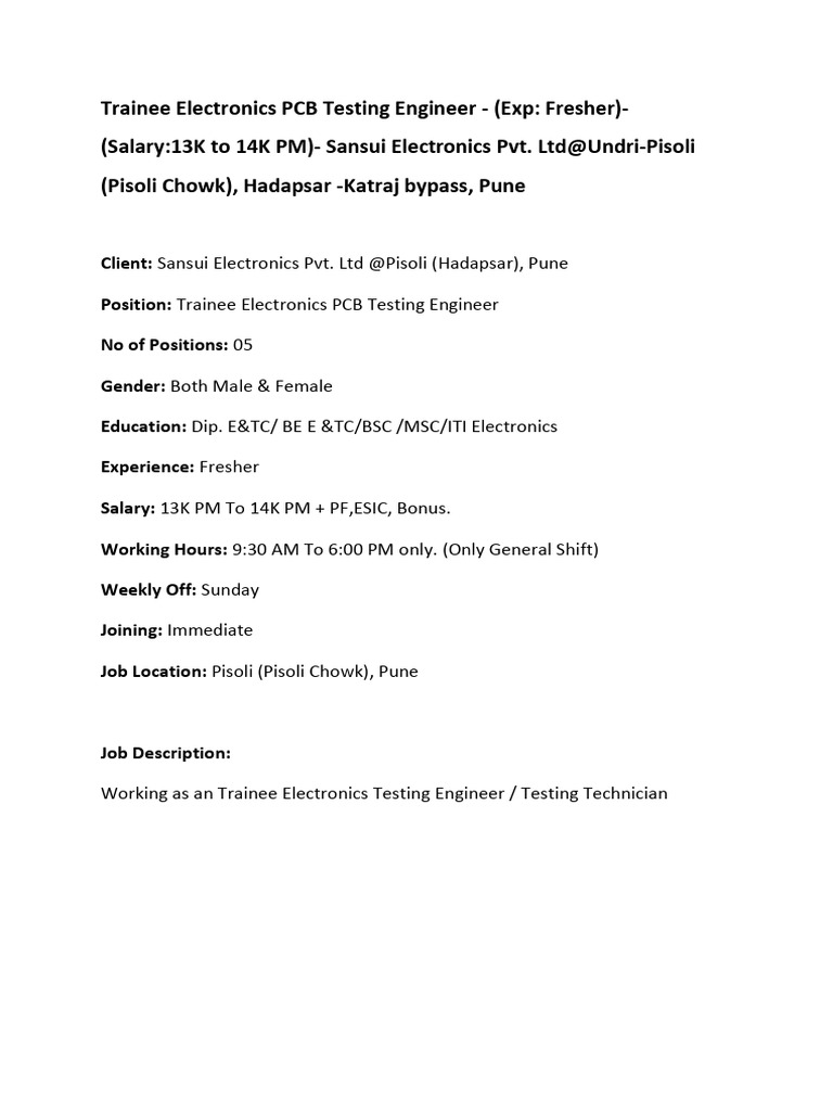 JD-Trainee Electronics PCB Testing Engineer | PDF | Career & Growth