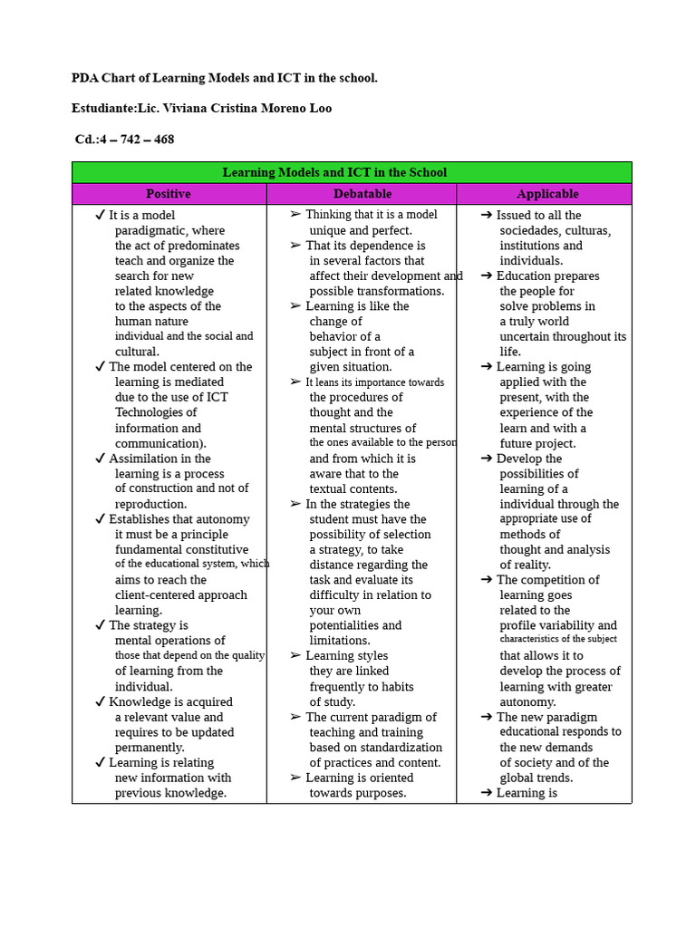 PDA Chart of Learning Models and ICT in School. Viviana Cristina Moreno ...