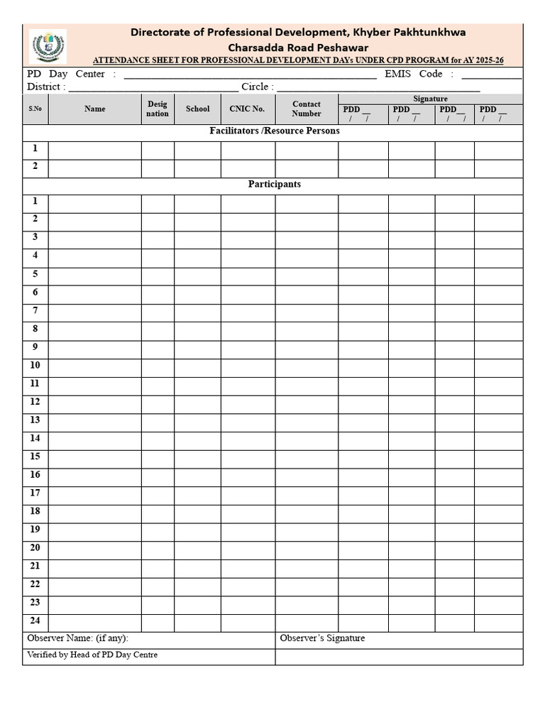 PDD Attendance Sheet 2025-26 | PDF