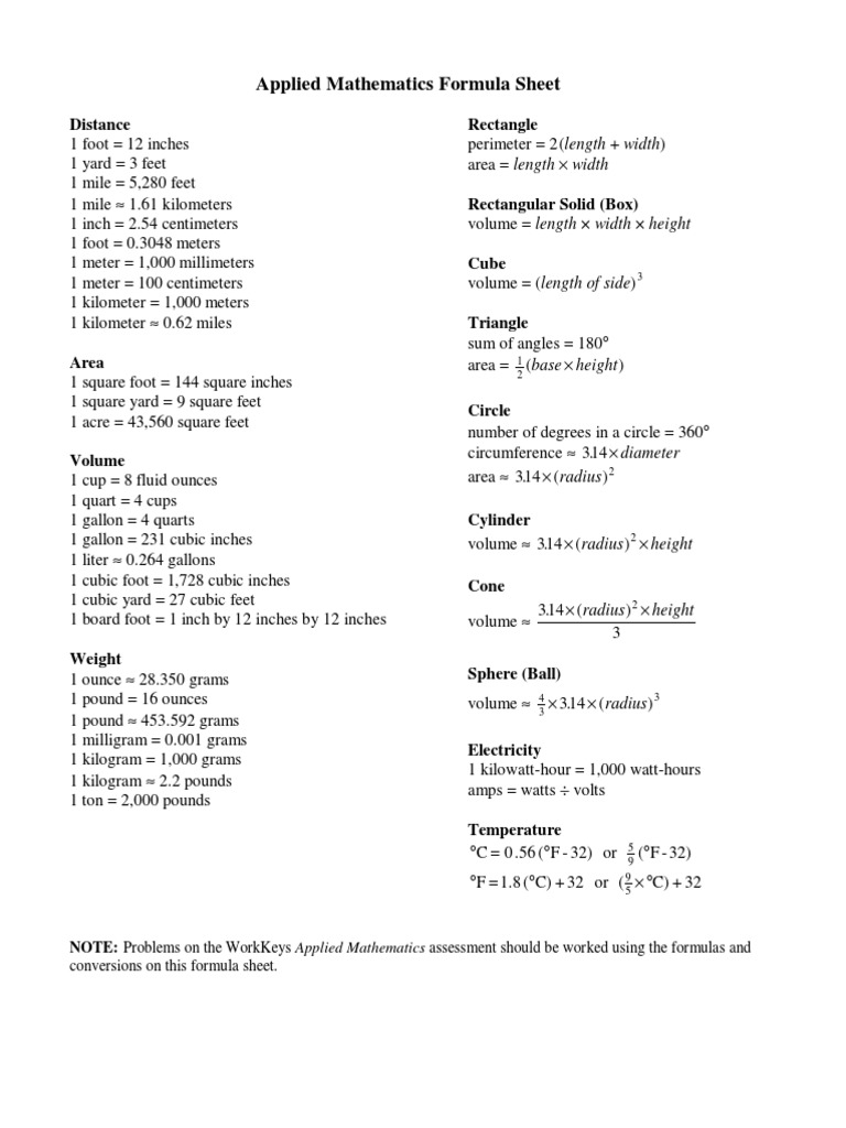 Workkeys Applied Math Formula Sheet Pdf - Design Talk