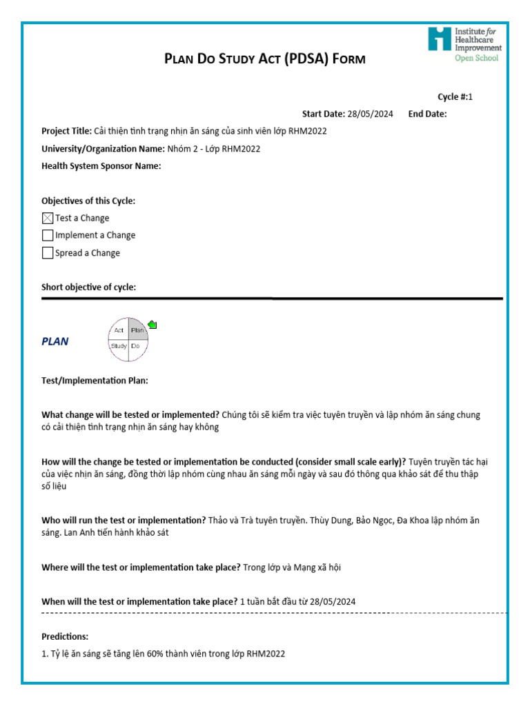 PDSA Form Template - Project Planning and Implementation Guide - Studocu