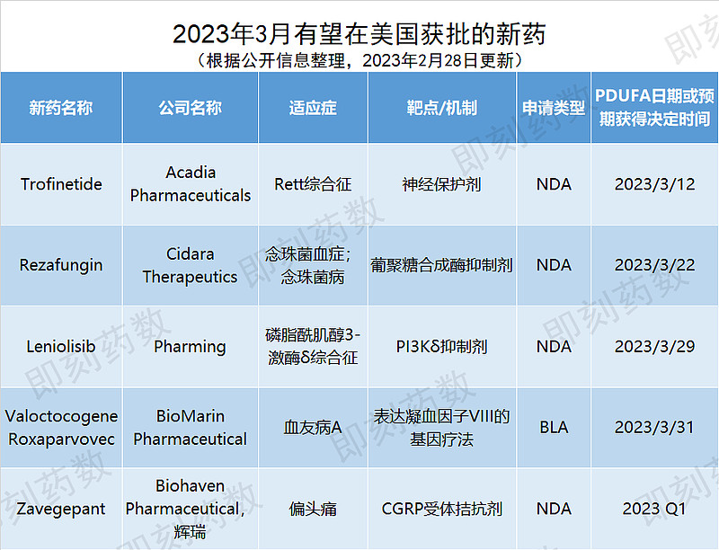 3月5款创新药有望获FDA批准 根据PDUFA的预期目标日期,预计3月,FDA将对5款创新药物的批准做出监管决定。 3月有望获FDA批准的新药 ...