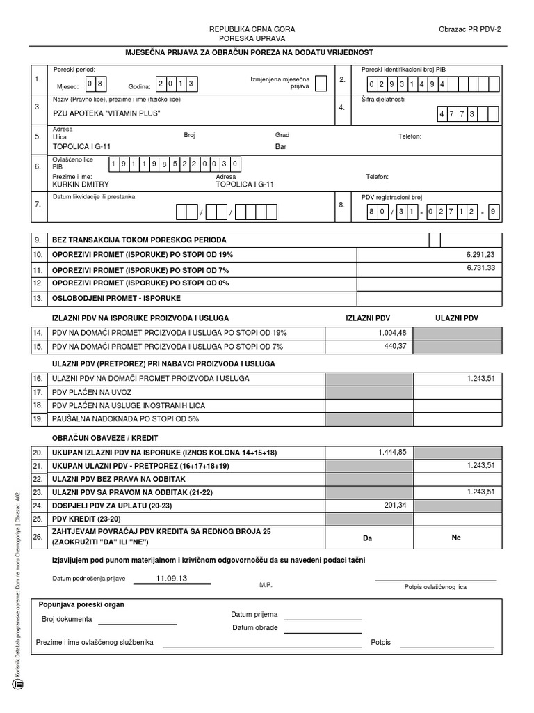 PDV Obrazac Crna Gora BLANKO | PDF
