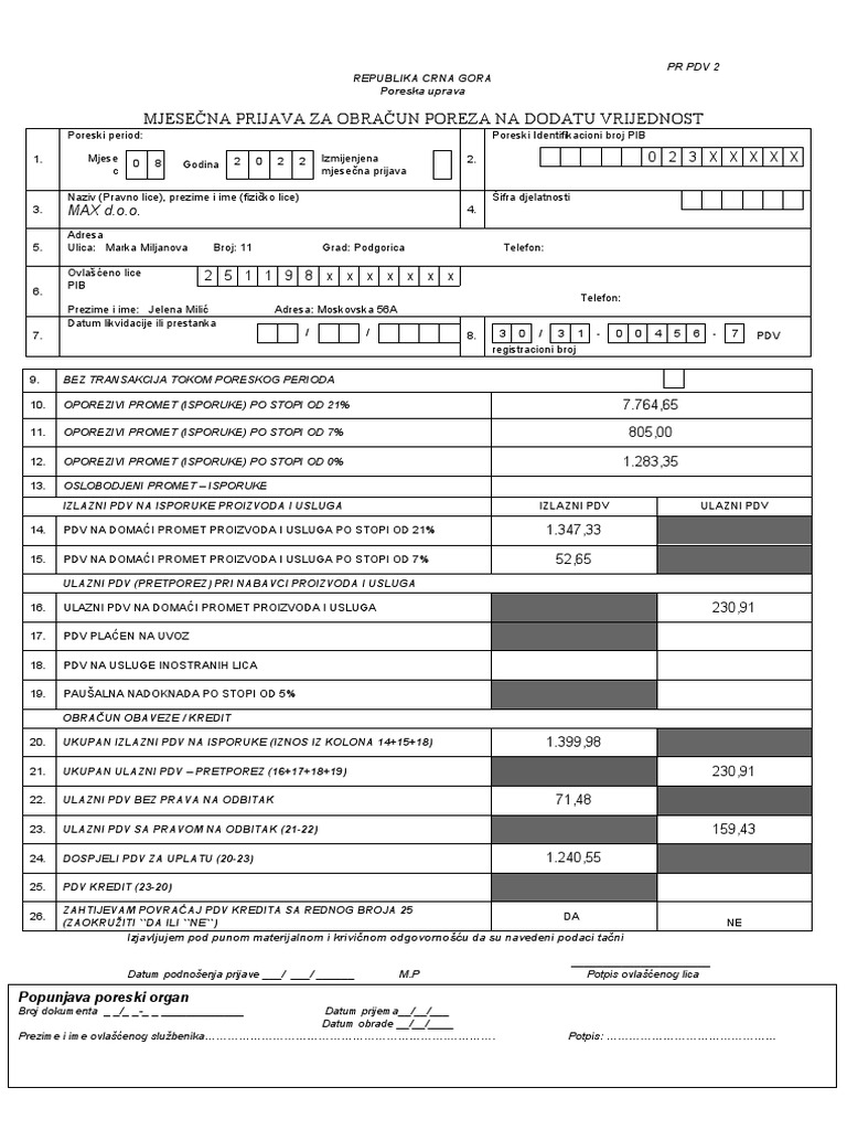 PDV Obrazac Crna Gora BLANKO | PDF
