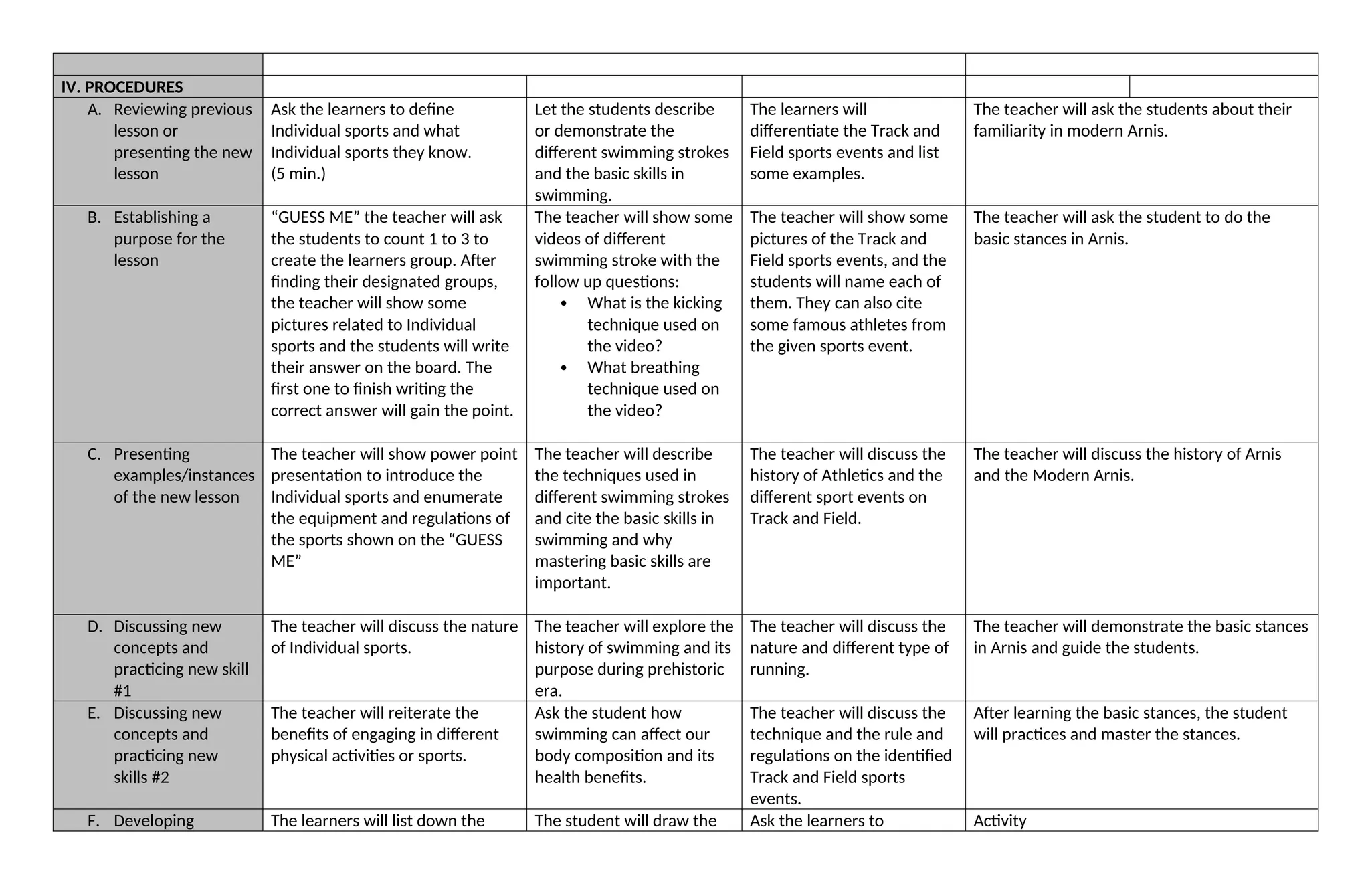 PE Lesson PLAN - PHYSICAL EDUCATION LESSON PLAN I. Learning Objectives ...
