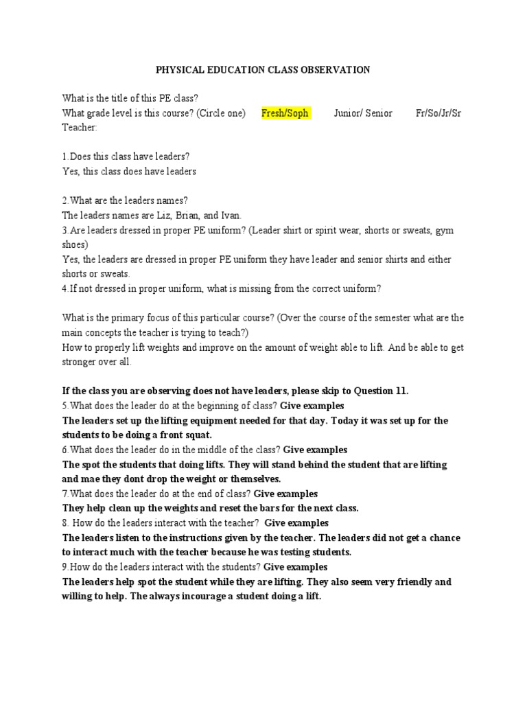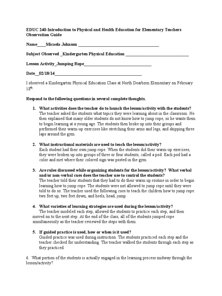 Effective Physical Education Lesson Observation Guide | Course Hero