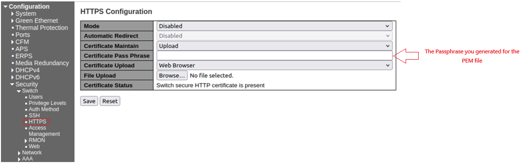 Upload of the encrypted private PEM file on the HTTPS configuration page